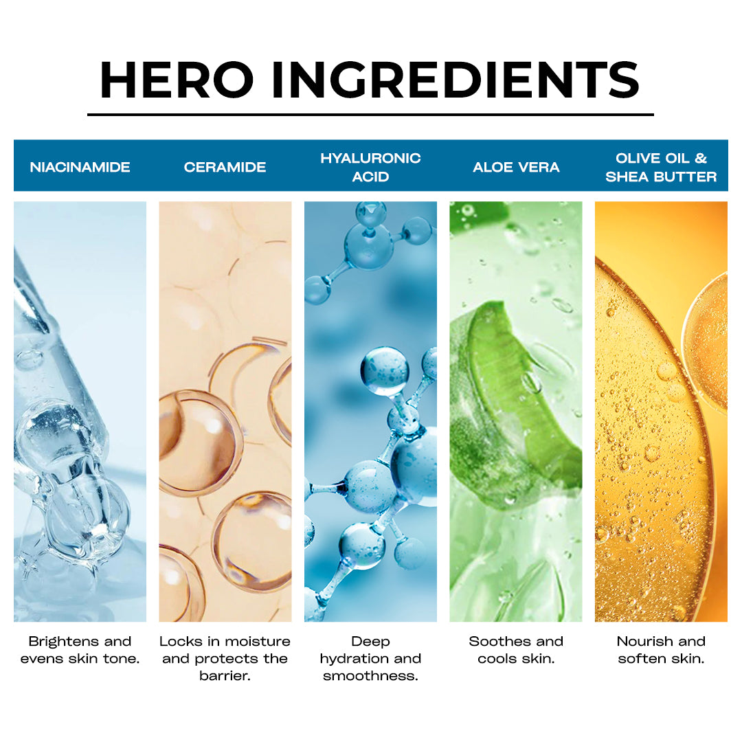 Niacinamide - Brightens dull skin, evens tone, and refines texture for a healthy glow.